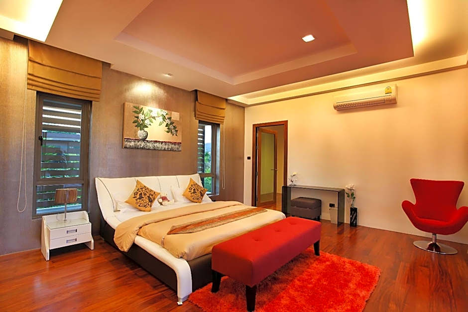 Featuring a spacious living and dining area that opens up to the pool deck on the ground floor, the luxurious villa also comes with a fully equipped kitchen. The bedrooms all has a walk-in closet and an private bathroom. Guests can relax at the open pavilion by the pool or make use of the outdoor shower and sauna.